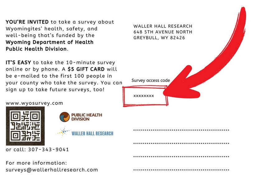You’re invited to take part in a short ten-minute survey about Wyomingites’ health, safety, and wellbeing that’s funded by the Wyoming Department of Health Public Health Division. Only households that have received the postcard below can participate in this survey.